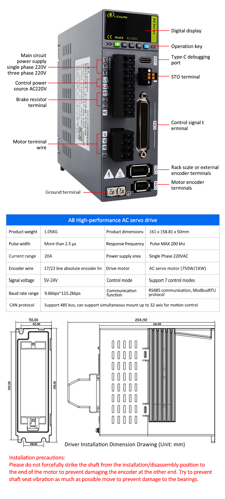 পালস/RS485 750W/1000W/1001W 2500/3000RPM A8 উচ্চ নির্ভুলতা STO ABZ AC সার্ভো মোটর ড্রাইভার কিট